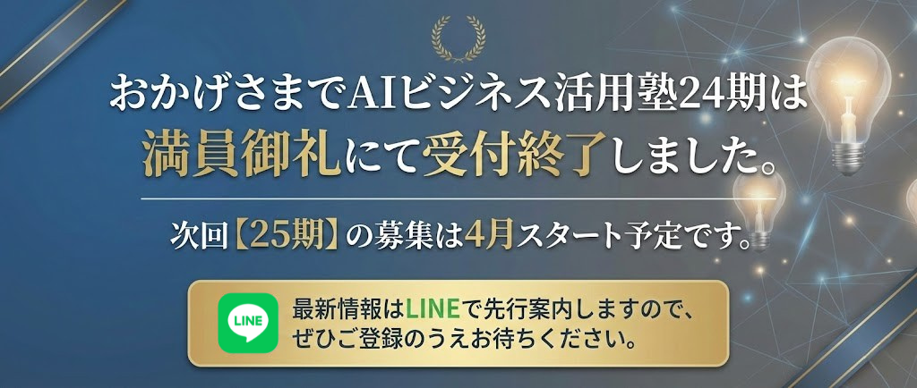 メルマガで定期的なAI活用情報の発信と、「AIビジネス活用塾」の開催情報をお届けしています!次期24期の案内もいち早く行いますので、興味のある方はぜひご登録ください!