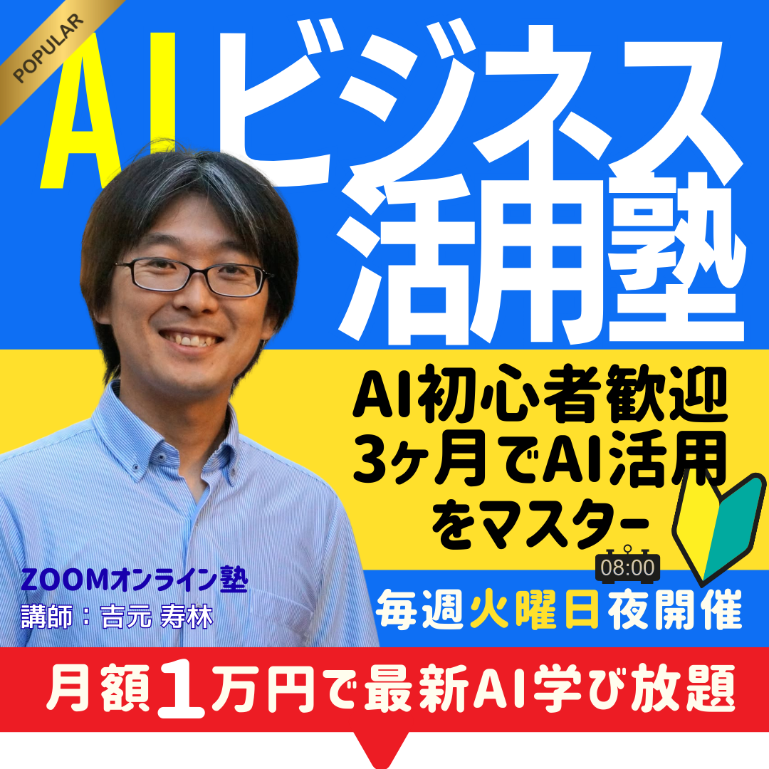こんにちは。「AIビジネス活用塾」講師の吉元寿林(じゅりん)です。
